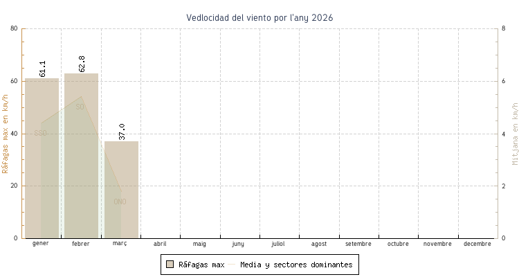 | febrer | 0.2 °C | 4.6 °C | 18.6 °C | 12.5 °C | 8.3 °C | 5.4 km/h | 62.8 km/h | SO |