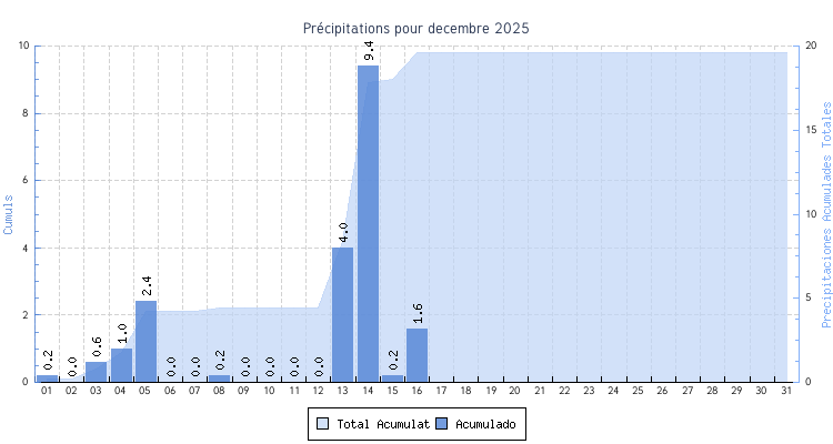 | Total | 0.2 °C | 17.4 °C | 8.2 °C | 2.5 km/h (41.8 km/h) | 19.6 mm | |