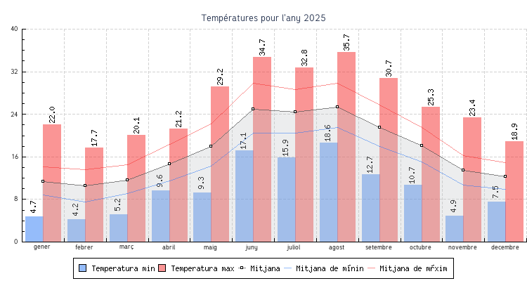 | Mes | Temperatures min | Temperatures max | Mitjana mensual |