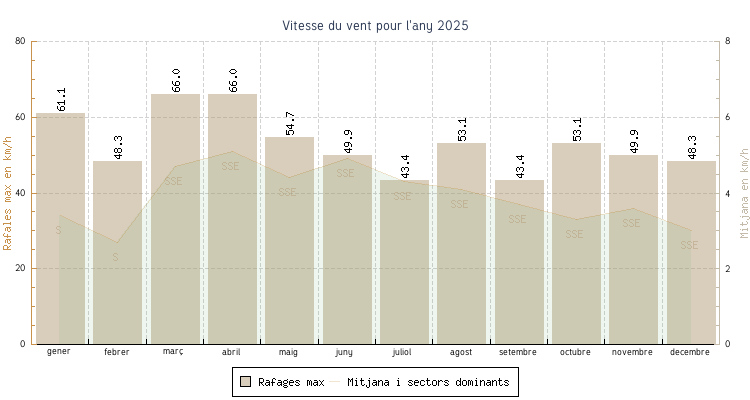 | maig | 9.3 °C | 14.2 °C | 29.2 °C | 22.2 °C | 18.0 °C | 4.4 km/h | 54.7 km/h | SSE |