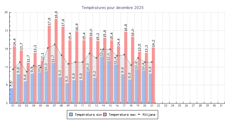 | 10 | 8.8 °C | 16.9 °C | 11.8 °C | 0.6 km/h (11.3 km/h) | SSE |