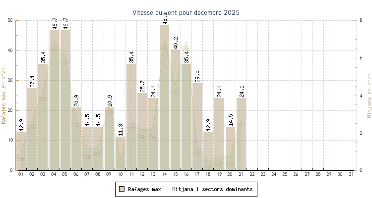 | min | max | mitjana | Velocitat (rafages) | Sector | ||