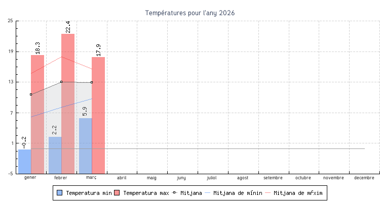| Mes | Temperatures min | Temperatures max | Mitjana mensual |