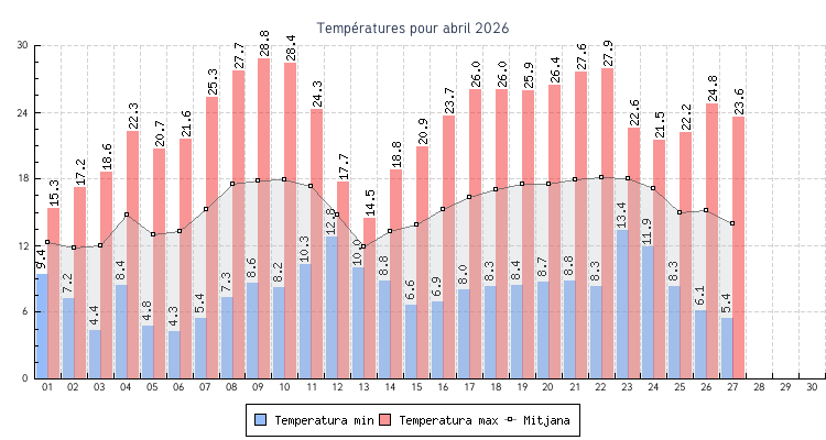 | 27 | 5.4 °C | 23.6 °C | 14.0 °C | 4.0 km/h (24.1 km/h) | NNE |