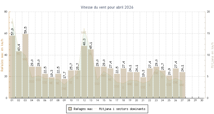 | min | max | mitjana | Velocitat (rafages) | Sector | ||