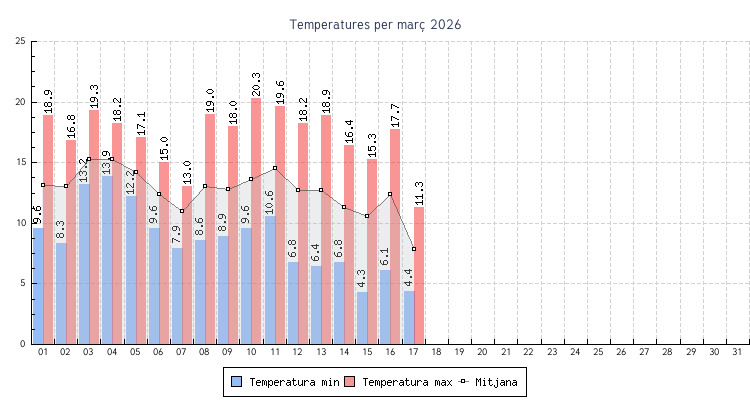 | 01 | 9.6 °C | 18.9 °C | 13.1 °C | 3.5 km/h (19.3 km/h) | NNE |