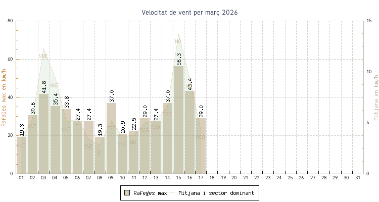 | min | max | mitjana | Velocitat (rafages) | Sector | ||