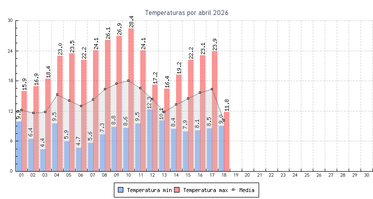 | 09 | 8.8 °C | 26.9 °C | 17.4 °C | 0.6 km/h (17.7 km/h) | SE |