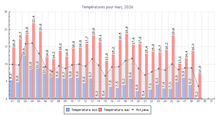 | 01 | 9.3 °C | 16.9 °C | 12.9 °C | 0.8 km/h (14.5 km/h) | SSE |